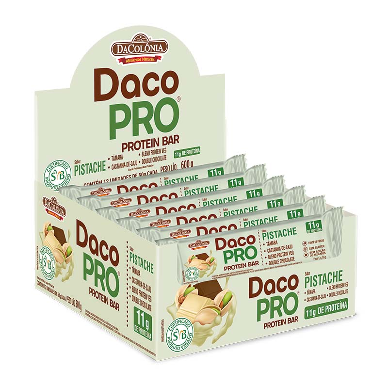 Descrição do produto: Barra Proteica DacoPro Portein Bar Pistache - Display 12 unidades de 50g cada (Peso Líquido: 600g)